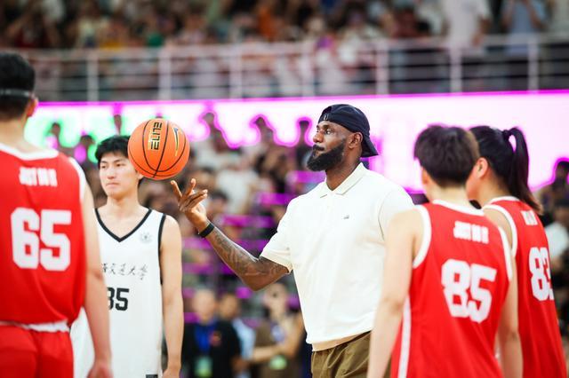 2025年9月4日下午,NBA篮球巨星勒布朗·詹姆斯空降上海交通大学新生篮球嘉年华现场,参与校园篮球互动。41岁的詹姆斯迎来第23个赛季,是联盟历史上职业生涯跨度最长的球员。他不仅为篮球比赛开球,还和现场大学生们展开亲切互动,这也是詹姆斯的第15次中国行,上海也是他到访次数最多的中国城市(第8次)。本报记者 海沙尔 摄